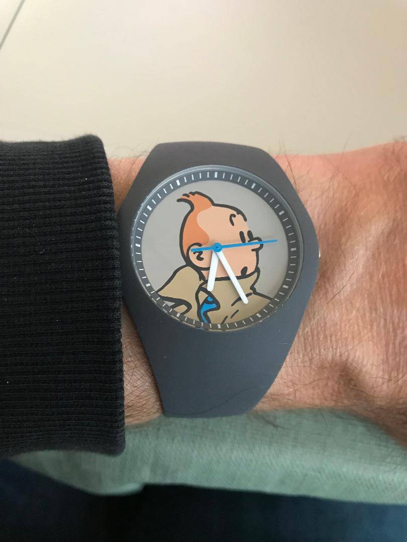 Voici mon dernier joujou (et j'en suis très fier !) : la montre Tintin ! Ainsi, le célèbre reporter est toujours à mes côtés. Enfin, à mon poignet. Je dirais même plus : Tintin est toujours à mon poignet !